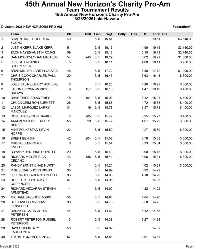 45th Annual New Horizons Charity Pro-AM Team Bass Tournament - March 28, 2026